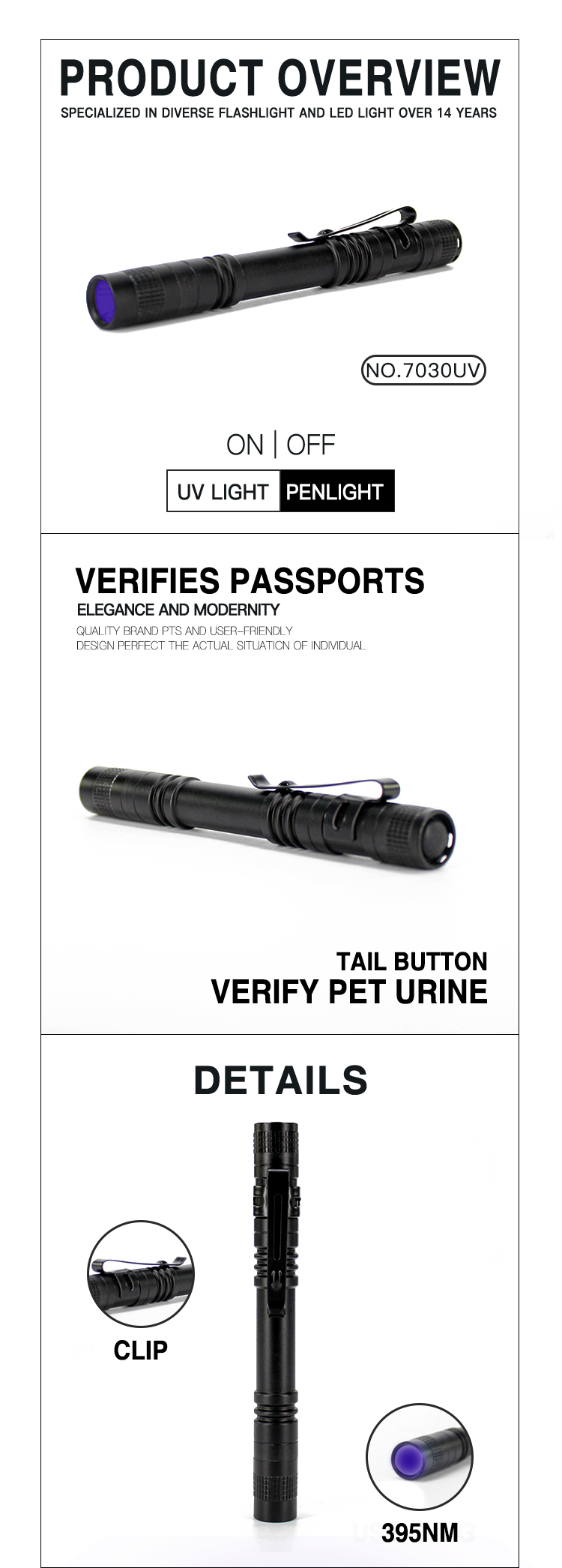 The Pen Light Flashlight is an ultra-portable tool with a powerful UV function, perfect for uncovering hidden fluorescent marks in anti-counterfeiting, scientific checks, or spotting stains.