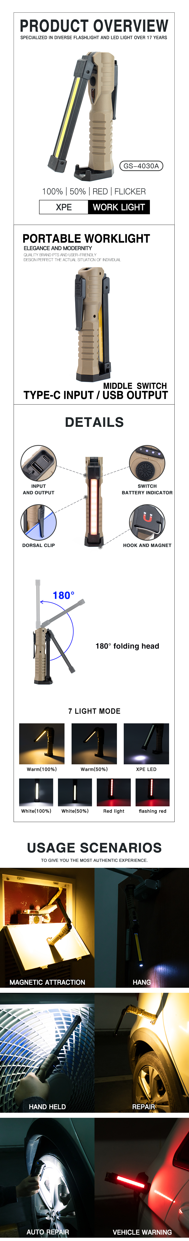 portable COB led flashlight magnetic working light rechargeable hanging lamp